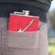 Hip flask with guitar and red background. You can customize the name or add any text you want.