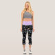 Fun cropped workout tights or Capri performance leggings for women. With classy, fun and contemporary teal, violet purple, orange, and lime green coloured abstract geometric triangles, polka dots and half circles mosaic pattern on a black background. Stylish original and cool cover for the trend-savvy and art-loving hip trendsetter, trendy look style motif lover. Show off your unique and personal style when you work out at the gym, relax and exercise at yoga class, or are jogging or running. Look cute and hip while being active and staying fit while wearing these cool yoga pants!