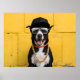 Hip Hop Dog Star in Trendy Cap and Chain. Stylish hip hop dog star striking a pose against a vibrant yellow wall. This funny animal portrait features a trendy dog wearing a cap, golden chain.