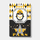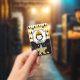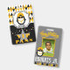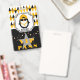 Cute VIP or VIB Pass features Penguin in black sunglasses, yellow backwards baseball hat and fly gold chain on a yellow, brown, black, white and grey colour scheme diamond background pattern. Happy Birthday yellow cursive text on the back with your own Photo and Text. Customise with your child's own initial and name. ©2022 Miss Sassy Party Designs