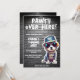 Cool first birthday party invitation. Design features a hip hop puppy dog wearing a blue snapback hat, hoodie, aviator sunglasses and a gold chain. Dark grey coloured brick wall background. Urban design. Great for one year old little boys.