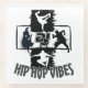 This image features a graphic design with a strong urban vibe. It's a black and white composition with a central focus on the word "DJ" in bold, stylised lettering. Surrounding the "DJ" are four silhouettes of break dancers, each frozen in a dynamic pose, showcasing the energy and athleticism of the dance style. The word "HIP HOP VIBES" is prominently displayed at the bottom, further solidifying the theme. The design incorporates a grunge aesthetic with brushstrokes and textures adding a raw and edgy feel. The overall impression is one of rhythm, movement, and the cultural power of hip hop.
