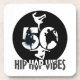 The image features a black and white design with the number "50" prominently displayed in the centre. The number is formed by three silhouettes of dancers, each performing a different hip hop move. The dancers are positioned in a dynamic way, creating a sense of energy and movement. Below the number, the phrase "HIP HOP VIBES" is written in bold, black letters. The background is a black circle, which adds a sense of depth and contrast to the design. The overall image is eye-catching and visually appealing, and effectively conveys the theme of hip hop culture.
