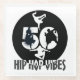 The image features a black and white design with the number "50" prominently displayed in the centre. The number is formed by three silhouettes of dancers, each performing a different hip hop move. The dancers are positioned in a dynamic way, creating a sense of energy and movement. Below the number, the phrase "HIP HOP VIBES" is written in bold, black letters. The background is a black circle, which adds a sense of depth and contrast to the design. The overall image is eye-catching and visually appealing, and effectively conveys the theme of hip hop culture.