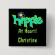 Show that you are a hippie at heart with this name badge that you can wear to introduce yourself at parties, meetings, and other fun events or wear to work. Revive this era with this whimsical word art " hippie " in turquoise aqua blue and outlined in bright lime green on a black background that you can change. The customisable words "at Heart" are below the word Hippie. Personalise with your name across the bottom or remove if you just want to wear the Hippie badge pin. The colourful and stylish graphic word hippie has the first i dotted with a flower, outlined in lavender purple in a whimsy 70's style. Celebrate the hippie attitude and way of life and with fun with a retro throwback to the late 60's and early 70's with style. The colours are turquoise aqua blue, lime green and lavender purple. Fully customisable to make it your own. Original art is by Phyllis Dobbs.