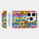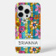 Make a retro statement with this groovy 70s inspired hippie flower power iphone 15 pro phone case! It's modern and trendy with bright multi-colored watercolor flowers. Make it uniquely yours with your name in a mod CAP font in black. It will look fabulous on your phone!