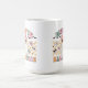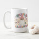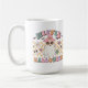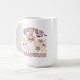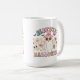 Cute, colourful, fun Hippie Halloween mug features a hippie ghost with pink witch hat, text that reads Hippie Halloween, and some flowers and little bats and skulls in lavender, melon, aqua, and pink!