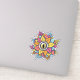 Spooky reptile eye sticker with a digital art of a weird eyeball with reptile iris and pupil surrounded with colourful petals. This crazy surreal illustration has fun yellow, orange, coral, pink and light blue colours with decorative elements and, being so strange, is great for Halloween.