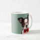 Cute illustration of a hipster style boston terrier puppy wearing eye glasses and chic red bow tie on blue background. Designed by Maryline Cazenave.