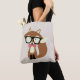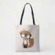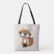 Adorable vector illustration of a cute brown fox wearing an oversized pair of reading glasses and a pink bow tie on a beige background. Add a name or monogram for a one-of-a-kind gift.