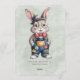 A cute cartoon illustration of a bunny wearing a gray fedora hat with a red band and round wire-rimmed glasses. The bunny has a cheerful expression with rosy pink cheeks and a small smile. It is wearing denim overalls with colorful patch details - yellow, pink, green, and blue squares sewn onto the legs. A red polka-dotted bow tie adorns its neck. The bunny's fur is rendered in light beige with subtle gray tones, and its ears are perked up and forward. The bunny is standing in a three-quarter view pose against a pure white background. The art style is soft and watercolor-like with clean lines and gentle shading. The overall composition has a whimsical, child-friendly aesthetic with a hipster-inspired outfit.
