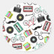 A sticker featuring a hipster themed design consisting of illustrations of bicycles, glasses, cassette tapes, vinyl records, skeleton keys, moustaches, cameras, and retro antenna television sets.