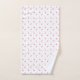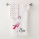 A custom set of his and hers towels featuring a watercolor style flamingo on the main bathroom towel and a flamingo pattern on the hand towel and rag.