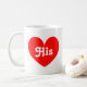 His and hers heart mugs | Create a matching set. Cute home decor for just married newly weds / husband and wife couple. Romantic gift idea for newlyweds / bride and groom. Also fun for wedding anniversary. Custom background colour behind red heart. Double sided design.