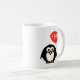 His and hers penguin mugs | matching set. Cute home decor for just married newly weds / husband and wife couple. Romantic gift idea for newlyweds / bride and groom. Also fun for wedding anniversary. Custom background colour behind red heart. Double sided design. Cute animal bird cartoon with red heart balloon.