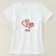 On both shirts Is a graphic of two intertwined red hearts. His shirt has the question: Will you spend the rest of your valentine's days with me? And on her shirt is inscribed her answer: Yes! The text are in template format so you can change the wording easily if you wish. For example, you may want to write, instead of 'Yes": "Yippee" or "Sure will!