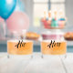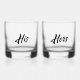 Whiskey glasses that feature the word His on one glass and Hers on the other glass, printed in black, stylised script. Perfect as a wedding gift for the newlywed bride and groom or for any married couple or pair!