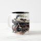 A vintage steam engine, painted in a deep black with red accents, races along a railway track. The engine's wheels churn, sending up puffs of smoke. The scene is set against a stark white background with watercolor-like splashes of colour, creating a sense of motion and energy. The overall impression is one of power, speed, and a nostalgic longing for a bygone era of travel.