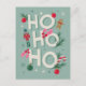 A playful design featuring bold "Ho Ho Ho" text decorated with classic Christmas icons like ornaments, a gingerbread man, candy canes, and pine branches. The colour palette of red, green, and white on a light blue background evokes festive cheer.
