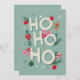 A playful design featuring bold "Ho Ho Ho" text decorated with classic Christmas icons like ornaments, a gingerbread man, candy canes, and pine branches. The colour palette of red, green, and white on a light blue background evokes festive cheer.