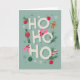A playful design featuring bold "Ho Ho Ho" text decorated with classic Christmas icons like ornaments, a gingerbread man, candy canes, and pine branches. The colour palette of red, green, and white on a light blue background evokes festive cheer.