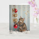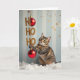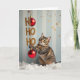 This photo shows a cute cat exploring a festive scene 🎄. The cat has green eyes and striped fur in brown and black 🐱. It's looking up at Christmas decorations like golden "HO HO HO" letters and a red bauble 🎅🏼. The cat's paw is holding the ornaments, looking mischievous 😺. The background has blue and white stripes with gold stars ✨. There's fluffy white material like snow under the cat 🌨️. This card captures the holiday spirit with a playful cat and decorations, perfect for spreading cheer 🎁.