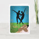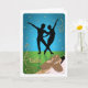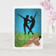 Celebrate the joy of ballet dancing with this any-age, any-occasion greeting card. In silhouette is a pas de deux backlit with blue lights, stars, and sparkles. The stage floor is a glow of green with stars and sparkles. The core of ballet exercises is done at the barre. With brown ballet shoes–you are ready for class. Gold ornaments decorate the card's corners with the word ballet in script typography. Inside: Blank for any occasion.