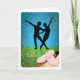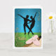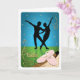 Celebrate the joy of ballet dancing with this any-age, any-occasion greeting card. In silhouette is a pas de deux backlit with blue lights, stars, and sparkles. The stage floor is a glow of green with stars and sparkles. The core of ballet exercises is done at the barre. With pink ballet shoes–you are ready for class. Gold ornaments decorate the card's corners with the word ballet in script typography. Inside: Blank for any occasion.