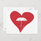 A white umbrella set against a red heart and with bridal gowns raining down around it.