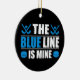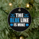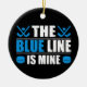 Hockey Blue Line ornament features blue pucks and hockey sticks with white and blue text that reads The Blue Line is Mine.