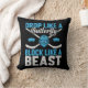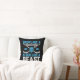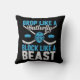 Hockey Goalie throw pillow with blue and white text, helmet with mask, pucks, and hockey sticks reads Drop Like a Butterfly Block Like a Beast!