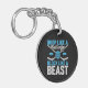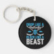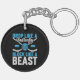 Hockey Goalie keychain with blue and white text, helmet with mask, pucks, and hockey sticks reads Drop Like a Butterfly Block Like a Beast!