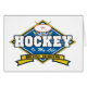 Blue and gold triangle sport logo featuring a crossed hockey stick and hockey puck with Hockey Is My Life text! Born to Play, Destined To Win yellow banner across the bottom! Great hockey gifts!