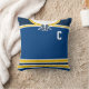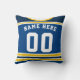 Easy to edit ice hockey or lacrosse custom jersey design throw pillow. Prominent colours of this jersey are blue and navy with gold stripes, the white parts can be changed, just click 'CUSTOMIZE' to choose a different colour. Just use the boxes to the right of the image to insert your own choice of name and number. You can also add either a captains 'C' or alternate 'A' or the sweater number on the front too.