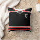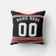 Easy to edit ice hockey or lacrosse custom jersey design throw pillow. Prominent colours of this jersey are black and red, the white parts can be changed, just click 'CUSTOMIZE' to choose a different colour. Just use the boxes to the right of the image to insert your own choice of name and number. You can also add either a captains 'C' or alternate 'A' or the sweater number on the front too.
