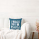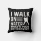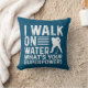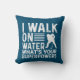 Hockey player throw pillow with a humourous saying features white text on a blue background and a white silhouette hockey player. The text on this hockey player pillow reads I Walk on Water What's Your Superpower?