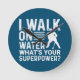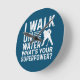 Hockey player wall clock with a humourous saying features white text on a blue background and a white silhouette hockey player. The text on this hockey player clock reads I Walk on Water What's Your Superpower?