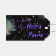 A perfect Happy Halloween Hocus Pocus gift tag designed with vibrant violet lettering and smoky stars on a black background.