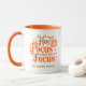 "Hocus pocus, I need wine to focus (or strong coffee)" saying printed in orange on both sides of a coffee cup, fun for Halloween for women or men.