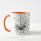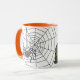Hocus Pocus I need my coffee to focus coffee mug. Black and orange with stars and moons and spider webs.
