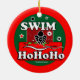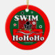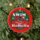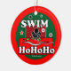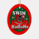 Breaststroke swimmer in black, white, red and green on a bright red background greets the holidays with SWIM Ho Ho Ho! Art on both sides of this ornament.