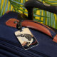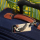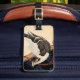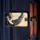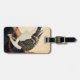 Hokusai Hawk luggage tag. Ukiyo-e animal painting from Edo period Japan. Katsushika Hokusai mastered multiple genres of Japanese painting and print making, including animal portraits. Hawk on a Ceremonial Stand depicts a regal black and white hawk crouching on a wooden ceremonial stand with gold trim and a red leather leash. The animal leans down and gazes at the viewer with its sharp black eye. A beautiful gift for fans of Hokusai, Ukiyo-e, Japanese art, and birds of prey.