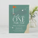 This retro modern "hole in one" gender-neutral 1st birthday golf party/par-tee invitation features a red flag and golf balls with a fairway and bunker in a golf course . The reverse side features a dark green background with a golf ball and tee pattern. Personalize it for your needs. You can find matching products at my store.