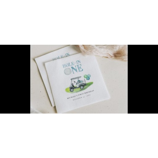 Make his 1st birthday a 'Hole in One' with our editable napkins, featuring a cute blue golf cart design! Perfect for adding a playful and memorable touch to his special celebration!