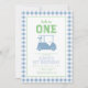 First birthday golf theme "Hole in One " with gold cart and light blue chequered plaid pattern.