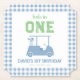 First birthday golf theme "Hole in One " with gold cart and light blue chequered plaid pattern.