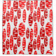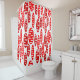 This shower curtain has a repeating pattern of ovals in red and brick with scattered white ovals.