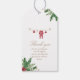 Add a charming touch to your gifts with this watercolor red baby outfit and pine greenery favour tag — perfect for a Christmas baby shower.