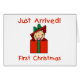An adorable baby girl pops up from inside a brightly wrapped holiday gift and text reads "Just Arrived! First Christmas" on baby's first Christmas tote bags, T-shirts, and more.