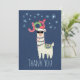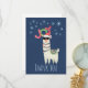A Christmas holiday gift basket thank you card. Designed with a funny illustration. A cute llama wearing black sunglasses and a red santa hat. Also wearing a South American styled blanket and pom-poms. The word Joy written above his head in a festive colourful font. Blue snowflakes falling down.